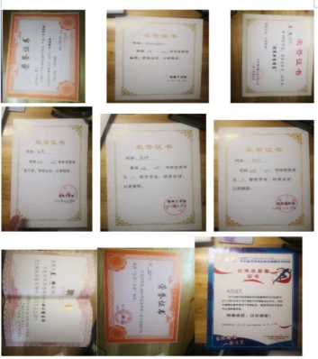 在校期间连续三年学习成绩和综测均在专业名列前茅,校级二等奖学金2次、校级三等奖学金1次、校优秀干部2次、校优秀团员干部1次、校优秀团员1次。;参加“三下乡”大学生社会实践活动1次。优秀志愿者,优秀工作者若干。