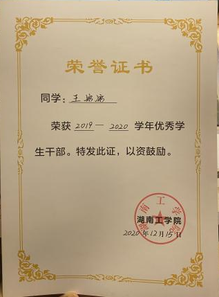 在校期间获评国家奖学金、国家励志奖学金、校一等优秀学生奖学金、校三好学生、校三好学生标兵、优秀共青团员、优秀共青团干部等多项荣誉。参加CaTICs网络大赛并获得CAD团队赛一等奖和CAD职业证书二级;加入雁鸣合唱团期间荣获304永利集团官网新生军训歌咏比赛二等奖;参加湖南省全国大学生成图大赛荣获个人全能一等奖,参加第十四届“高教杯”全国大学生成图大赛获得个人全能二等奖;暑假期间,参加家乡青年志愿者活动荣获独塘乡抗疫志愿活动“最美志愿者”称号。