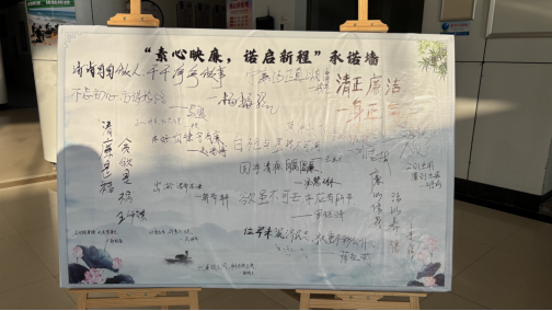 在机械楼一楼大厅,学院摆放了“素心映廉・诺启新程”承诺墙。毕业生党员纷纷在承诺墙上写下一句句饱含决心的纪律箴言,并签上姓名。这些真挚的话语,不仅是对廉洁从业的郑重承诺,更成为党员互相监督、共同进步的行动指南。