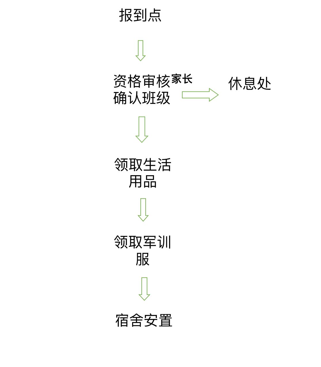 自行确认专业班级——报道点资格审核——领取生活用品——领取军训服——宿舍安置。