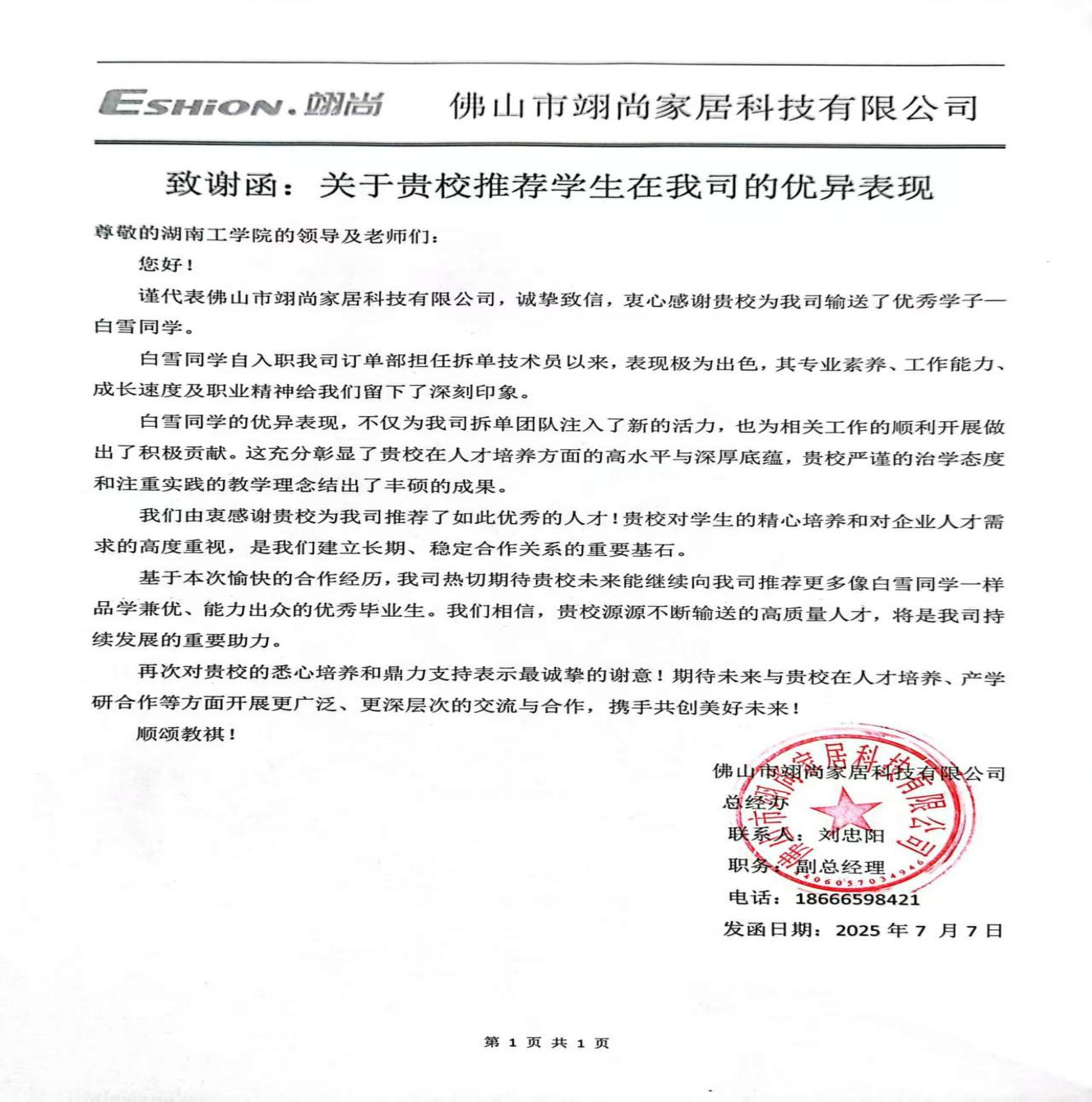 近日,本院2024届毕业生工业设计2001班白雪因工作表现优秀,收到企业发来的表彰信,信中高度评价该生“专业扎实、创新力强、适应力突出”,充分彰显了学院“产教融合、协同育人”模式的显著成效。佛山翊尚家居科技有限公司是我院2023年签订的校企合作单位,企业表彰是对学院育人模式的肯定。我院将持续推进‘招生-培养-就业’联动机制,搭建“政府”+“企业”+“虚拟教研室”+“工作室”+“学业导师”+“学生社团”平台,以项目为抓手,六位一体,产教研融合,培养立足衡阳,面向湖南,辐射全国的高素质应用型设计人才。