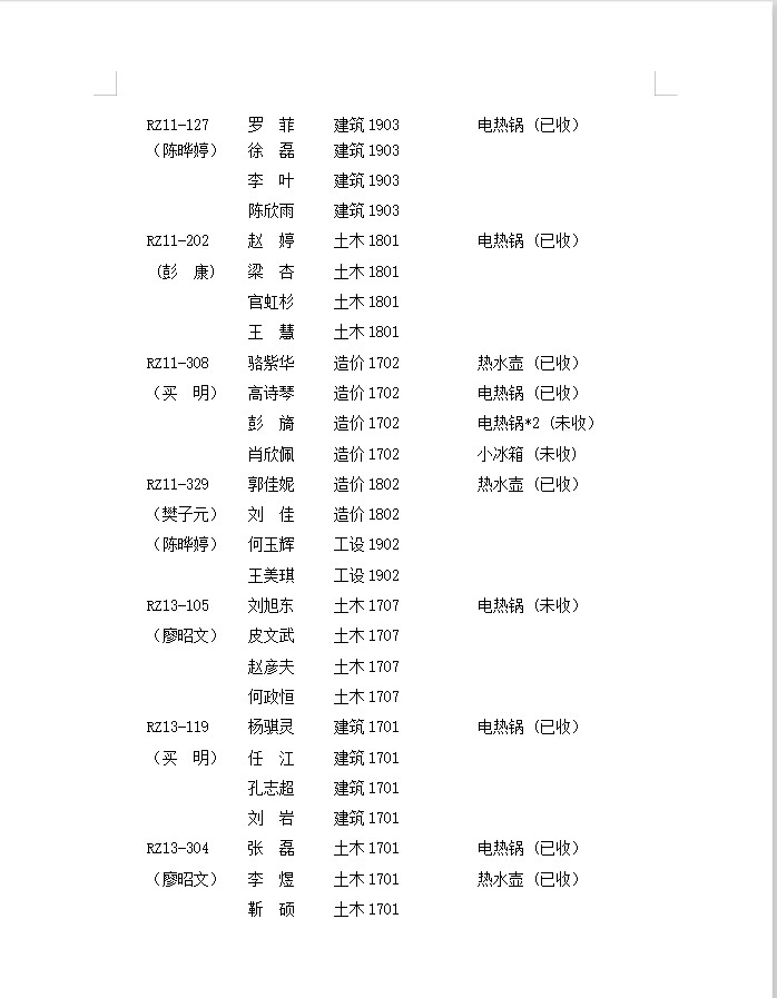 第九周突击检查寝室公示表