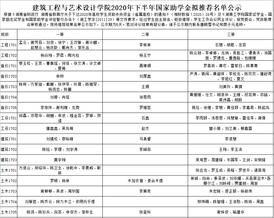建筑工程与艺术设计学院2020年下半年国家助学金拟推荐名单公示