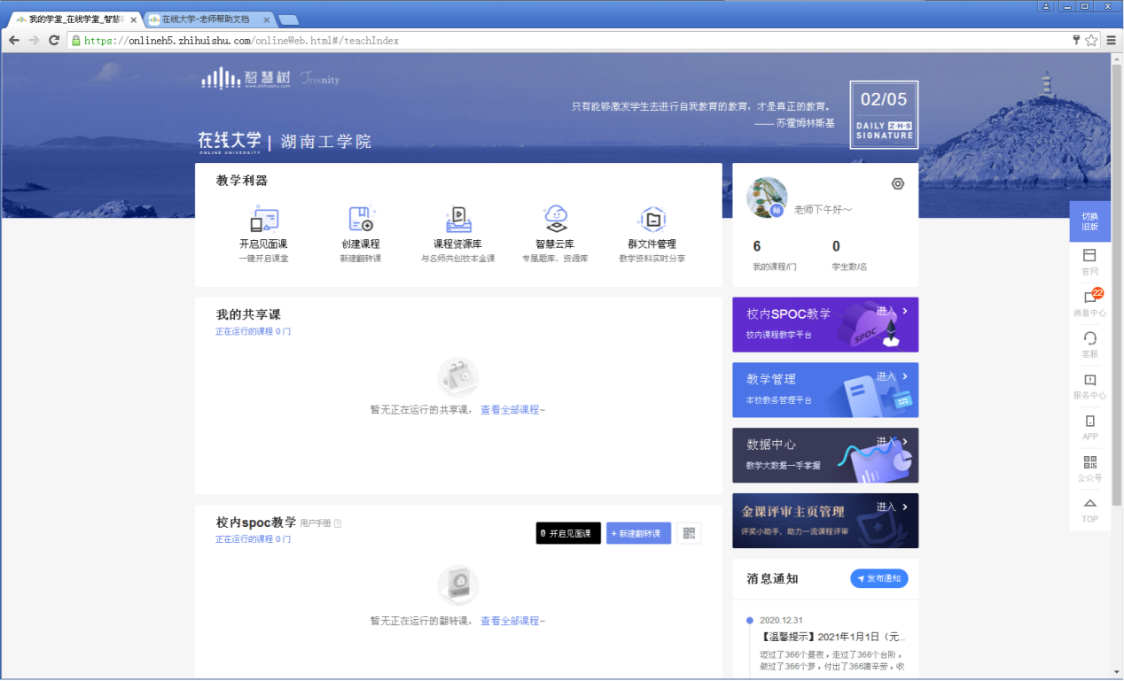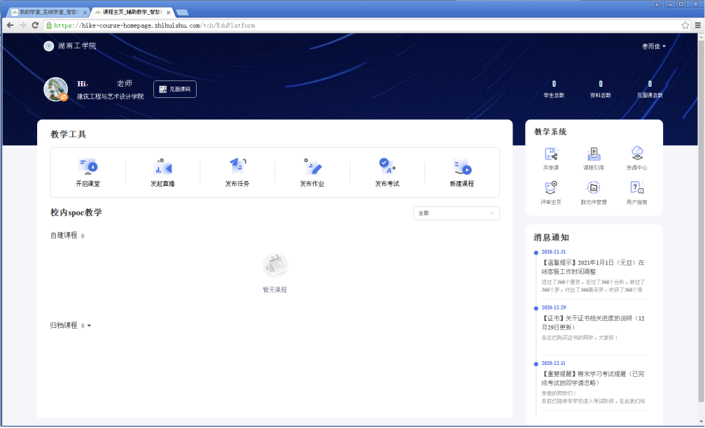 各任课教师可以使用雨课堂、知到(教师版)、学习通等专业信息化教学软件(教学软件可自行下载,注册,创建班课等),有条件的要利用自建资源或者智慧树平台的优质课程资源(智慧树平台课程永利已开放权限,老师可以创建课程,还可以利用线上金课,快速搭建课程等),开展线上线下结合的混合式教学,在假期期间做好课程信息化教学相关准备工作。