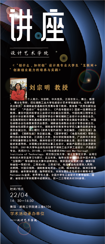 讲座嘉宾:刘宗明,中共党员,江西吉安人,博士,教授,博士生导师。现任湖南工业大学包装设计艺术学院副院长,校学术委员会委员。