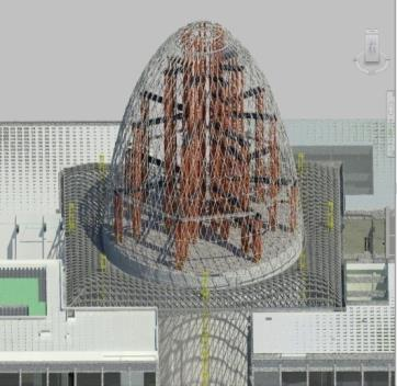 钢结构形式复杂,既有单一规则的片状平面桁架,又有不规则的变截面组合桁架,部分构件呈现出不规则扭曲,Takle节点绘制中反复探索。