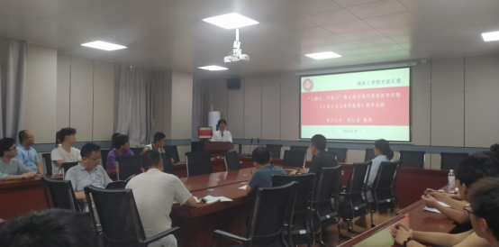欧红香教授首先简要介绍了常州大学的办学历史及学校概况。随后通过“课程目的”“如何建设”及“如何实施”分享了所参与的课程建设经验,并从课程背景及目标、教学创新拟解决的主要问题、创新理念与总体设计、创新举措及成效等方面进行了讲解。最后,欧教授提出自己了关于课程建设和教研体会的感悟,认为“育人为本,课程不仅是支撑毕业要求的基础,更是学生获取知识、能力的重要途径”。会后,欧教授和参会师生进行了深入的交流。(文/郭胜利 图/郭胜利 审稿人/一审:邹衍华 二审:胡鸿 三审:陈健)