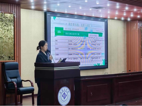 往届获奖优秀团队代表祝佳欣同学,结合团队曾获国家级三等奖的项目,从自身参赛心理路程,分享自己的备赛过程,打磨报告的经历。她强调:“比赛的目的不止于得奖,更在于过程中的成长。”
