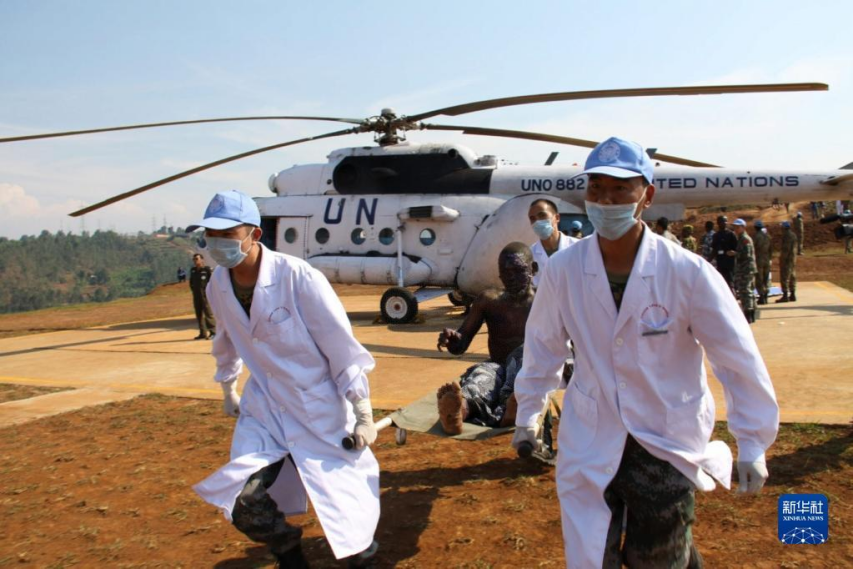2010年7月3日,中国赴刚果(金)维和医疗分队医护人员在刚果(金)南基伍省布卡武机场运送油罐车爆炸中的受伤者。新华社发(郭云飞摄)