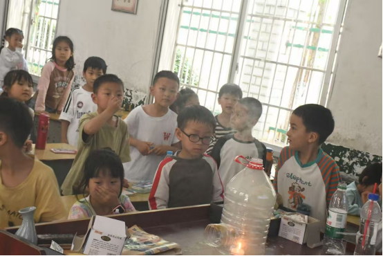 课堂上,志愿者们从生活中的常见现象入手,抛出一个个饶有趣味的问题,瞬间点燃了孩子们眼中的好奇火花。紧接着,“烟囱效应大挑战”、“自制饮水机大挑战”、“神奇的瓶子”等一系列妙趣横生的实验轮番上演。