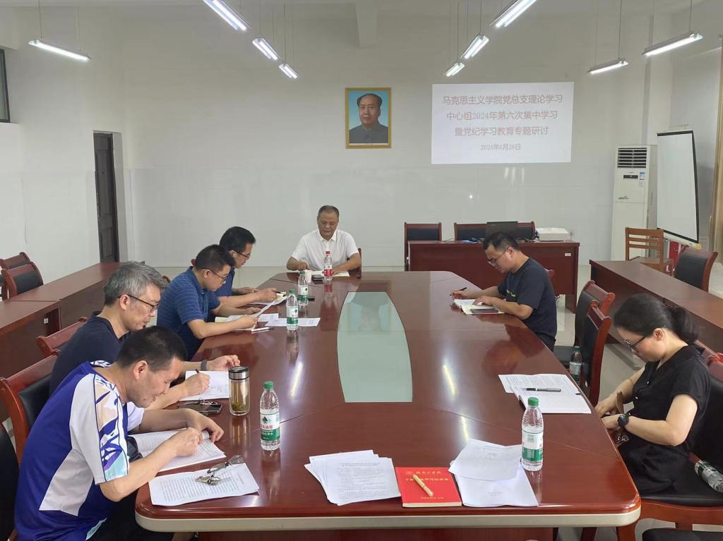 6月28日下午,马克思主义学院党总支在社科楼318会议室召开理论学习中心组2024年第六次集中学习暨党纪学习教育专题研讨,院党总支书记、院长张冬毛主持会议,校党委委员、副校长谢柯全程进行了巡听,院党总支理论学习中心组全体成员、各支部书记、全体科级干部参加了会议。