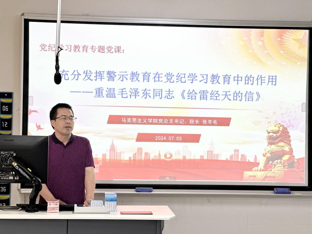 会上,支部书记领学习近平总书记关于全面加强党的纪律建设的重要论述;全体教师共同观看了警示教育专题片《师德失范典型案例(高校篇)》;马克思主义学院党总支书记、院长张冬毛以《充分发挥警示教育在党纪学习教育中的作用——重温毛泽东同志<给雷经天的信>》为题为教工二支部全体党员讲授专题党课。