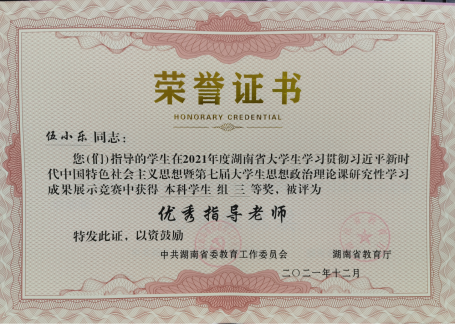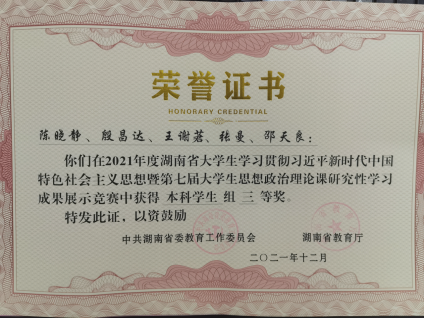 近日,从省教育厅《关于公布湖南省大学生学习贯彻习近平新时代中国特色社会主义思想暨第七届大学生思想政治理论课研究性学习成果展示竞赛结果的通知》(湘教通2021[359] 号)文件获悉,由永利环境2001班陈晓静等五位同学组成的思想政治理论课研究性学习小组荣获本科组三等奖,指导老师伍小乐荣获优秀指导老师,永利荣获优秀组织奖。