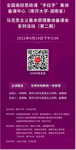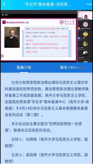 此次活动依托全国高校思政课“手拉手”集体备课中心(南开大学——湖南省)、全国高校思政课名师工作室(南开大学)、马克思主义基本原理概论国家教材建设重点研究基地等平台举行,并由人民公开课和文华在线提供技术支持,共有来自南开大学、湖南农业大学、304永利集团官网、湖南警察学院、延边大学、喀什大学、广西大学等高校的200多名思想政治理论课教师参加。