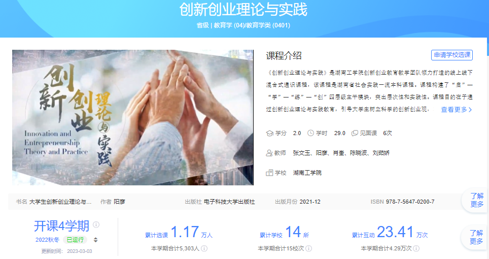 一是学创融合见成效。全面实施《大学生职业生涯规划与就业指导》课程混合式教学;打造湖南省社会实践一流课程《创新创业理论与实践》,依托于该课程的线上课程已被14个学校选用,选课人数达1.17万余人;组织编写的湖南省社会实践一流课程配套教材《创造辉煌人生-大学生创新创业理论与实践》已出版。