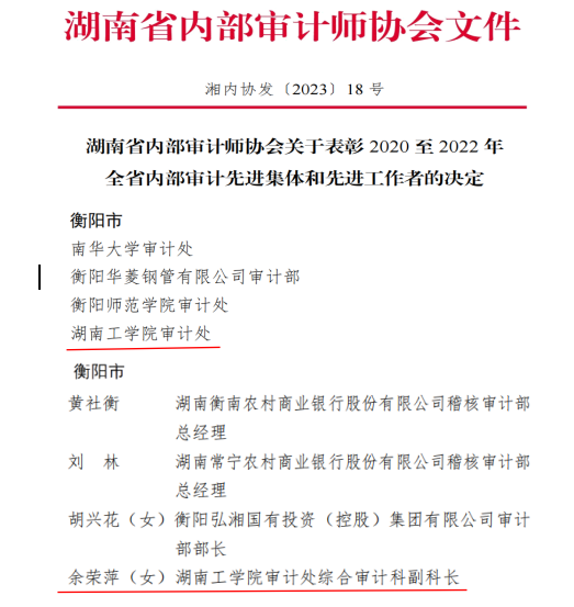 此外,在湖南省内部审计师协会组织开展的2020至2022年全省内部审计“双先”评选活动中,永利审计处获评“全省内部审计先进集体”,审计处余荣萍同志获评“全省内部审计先进工作者”。