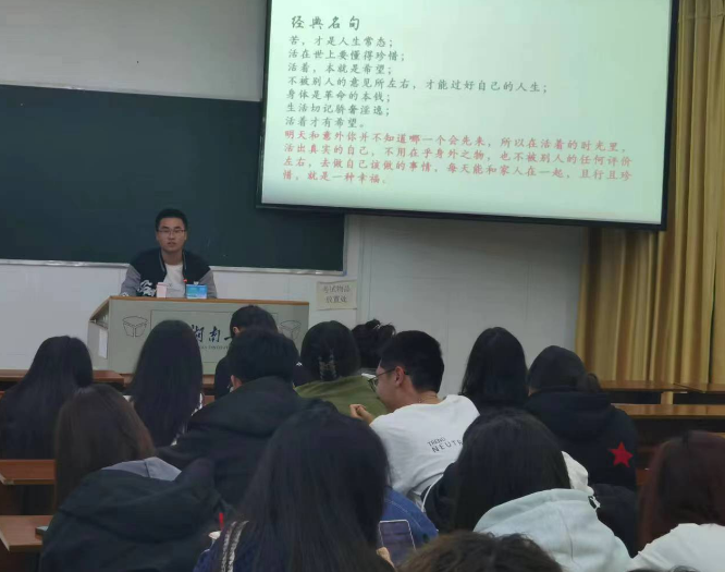 分享会上,同学们一边介绍自己读书的内容,一边向同学们分享自己的阅读心得。阿依古丽·萨塔尔和杨俊龙同学先后向同学们介绍了《活着》、《平凡的世界》、《曾国藩传》、《瓦尔登湖》等书籍,他们认为这些书籍能够帮助同学们树立信心和理想,激发对生活的激情和期望。