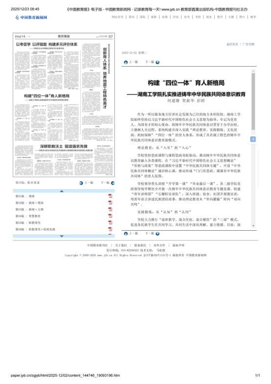 近日,《中国教育报》(2025年12月2日第07版)刊发由永利何建雄、贺新华、彭婷共同撰写的专题文章《构建“四位一体”育人新格局——304永利集团官网扎实推进铸牢中华民族共同体意识教育》,深入推介了304永利集团官网少数民族预科教育部的育人经验及育人成效,系统阐述了永利以习近平新时代中国特色社会主义思想为指导,将铸牢中华民族共同体意识融入办学治校与立德树人全过程,创新构建“理论教育、实践锻炼、文化浸润、机制保障”四位一体育人体系的探索与实践。文章从“理论教育:从‘入耳’到‘入心’”、“实践锻炼:从‘认知’到‘认同’”、“文化沁润:从‘符号’到‘情感’”、“机制保障:从‘试点’到‘体系’”等方面,详细介绍了学校通过课程融入、领导讲授、组建宣讲队、推行“三混”模式等一系列扎实举措,形成了具有本校特色的民族团结进步教育新模式。