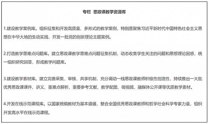 12.推进国家智慧教育平台建设使用。教育部把大思政课摆在教育信息化的突出位置,加强国家智慧教育平台思政教育资源建设。通过项目支持的方式,推动教学资源建设常态化机制化。组织开发和推荐一批科学权威实用的课件、讲义,推动一线教师统一使用。加强思政课教学资源库建设,实施中小学思政课精品课程建设计划,推出一批思政金课。加大优质资源推广使用力度,指导各地各校用好国家智慧教育平台。