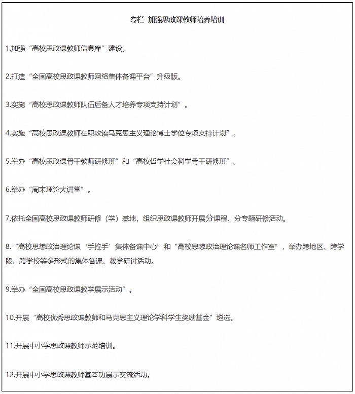 19.全面推进课程思政高质量建设。教育部组建高等学校课程思政教学指导委员会,研制普通本科专业类课程思政教学指南,组织开展高校教师课程思政教学能力培训,建设一批课程思政系列共享资源库。建成一批课程思政示范高校,推出一批课程思政示范课程,选树一批课程思政教学名师和团队,建设一批高校课程思政教学研究示范中心。加强中小学学科德育建设。