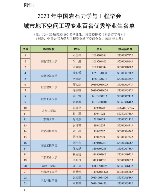 近日,中国岩石力学与工程学会发布了《关于2023年中国岩石力学与工程学会城市地下空间工程专业百名优秀毕业生的通报》,经全国十一所高校城市地下空间工程专业领域的专家组成评审委员会评定,决定授予全国39所高校的100位同学为“2023年中国岩石力学与工程学会城市地下空间工程专业优秀毕业生”荣誉称号,永利城市地下空间工程专业2023届毕业生闾兵同学获此殊荣。