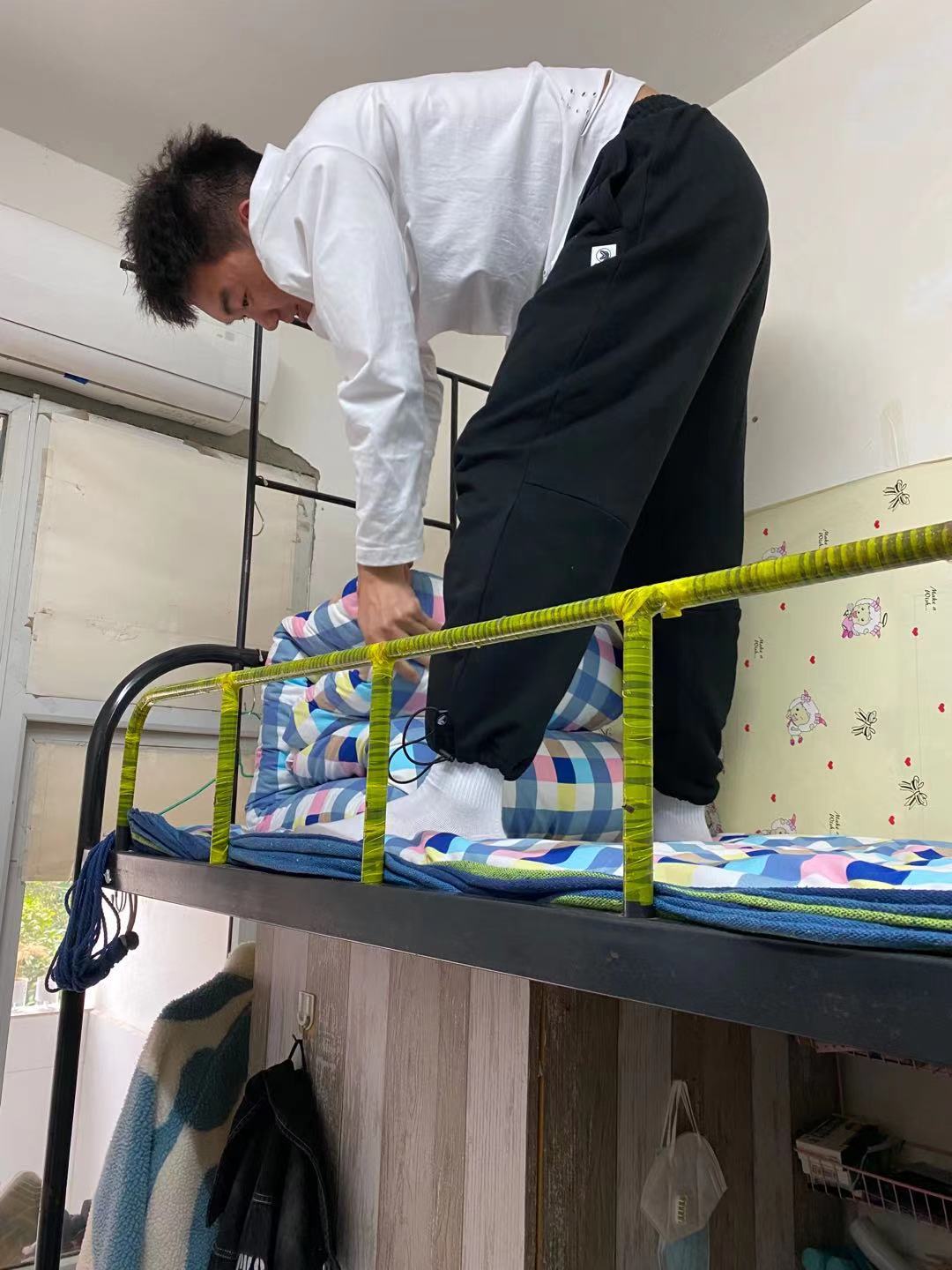 建工学院曹毅书记与辅导员下宿舍,督促学生叠好被子搞好卫生,并关心毕业生就业情况。