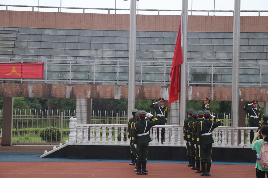 在全体师生庄严注目下,国旗护卫队踏着铿锵有力的步伐,正步走过田径场。五星红旗冉冉升起,在场师生敬礼仰注,心中一团团热火熊熊燃烧,为我们伟大祖国的日益繁荣昌盛而深感自豪。鲜红的国旗如同火焰一般点燃了同学们作为新时代的新青年内心的热情,成为天空中一抹绚丽的色彩。