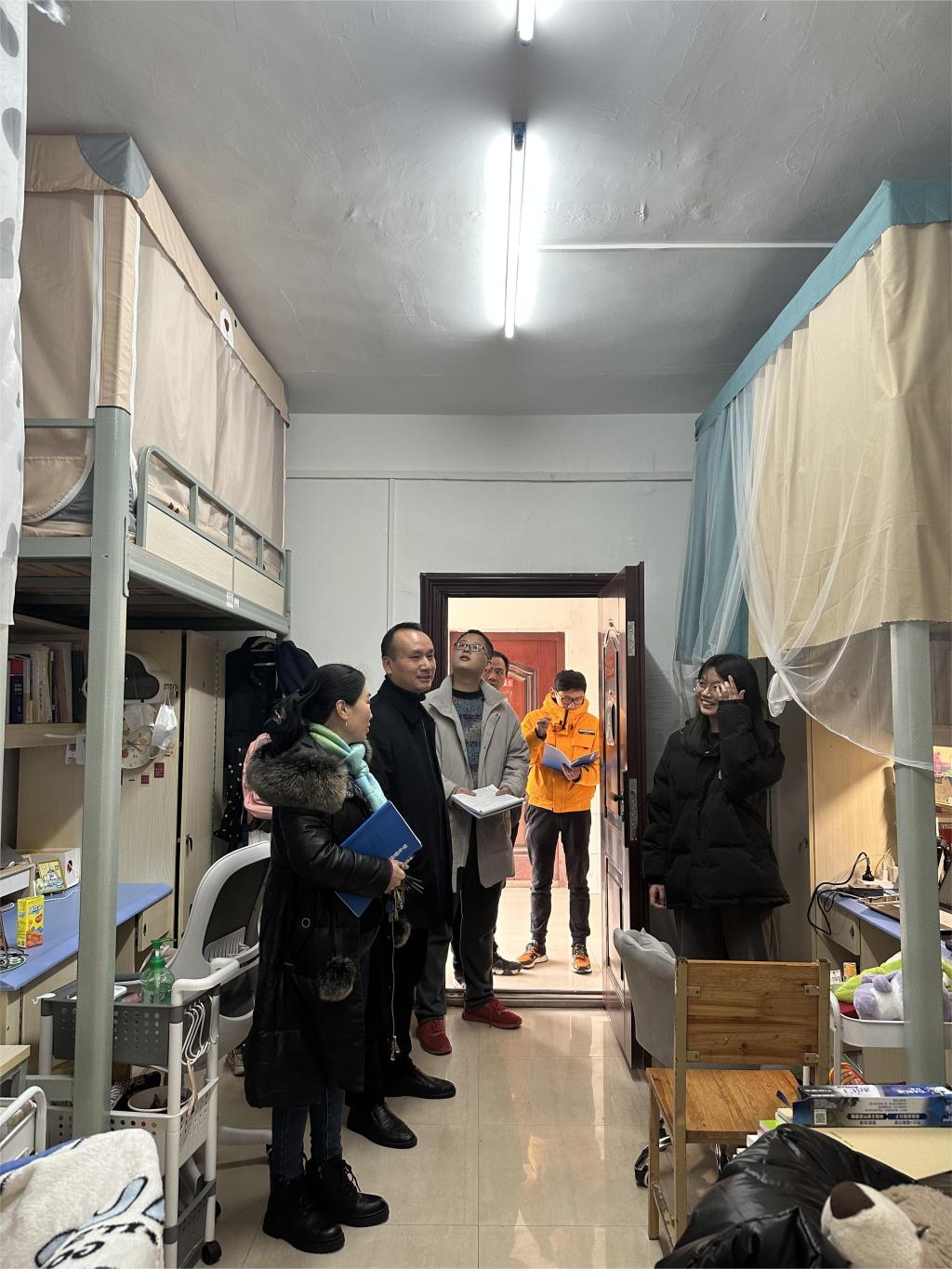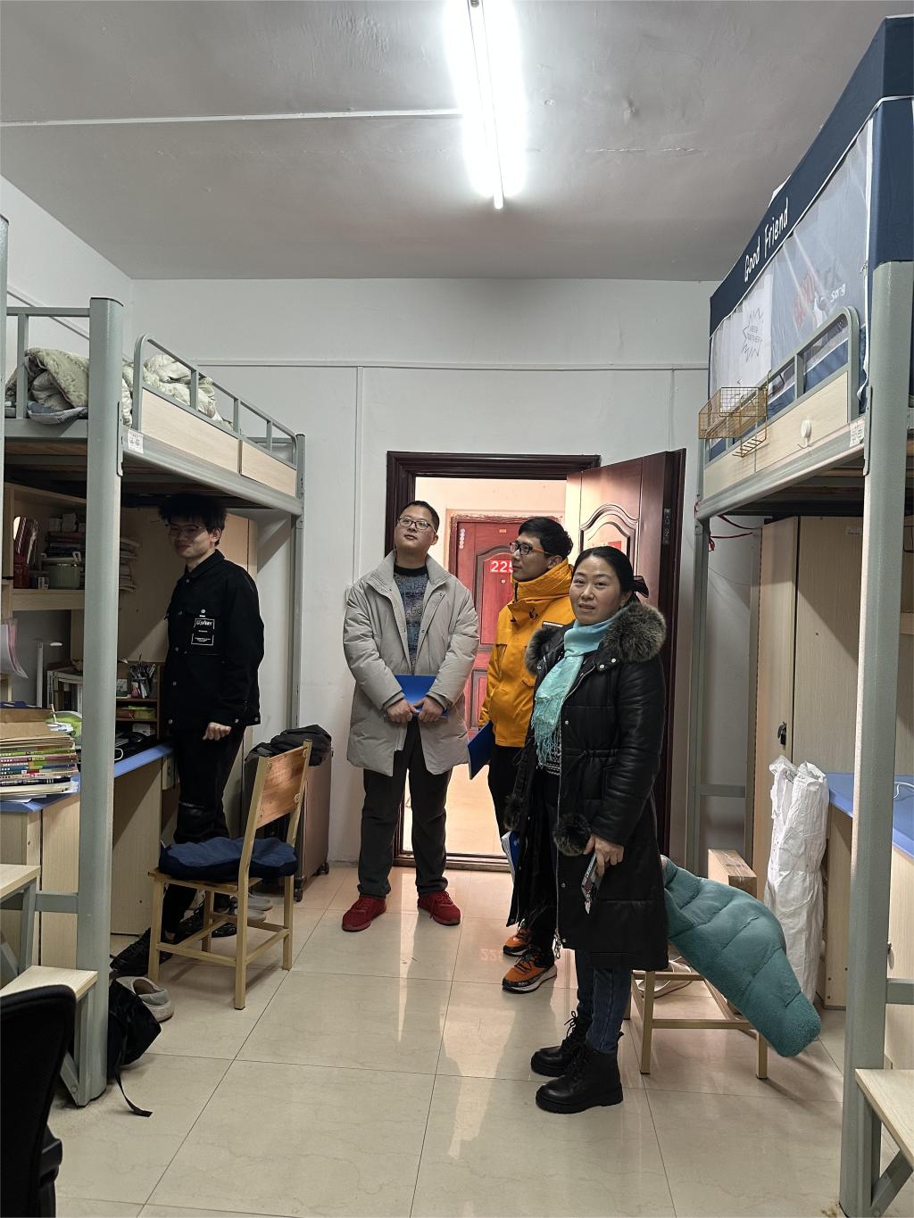 走访过程中,学院领导和老师向同学们致以新年祝福,与大家进行亲切交流,关切询问他们的假期生活、学习情况。借此机会刘斌嘱咐同学们做到:严格遵守宿舍安全管理规定,保持宿舍环境干净整洁,营造良好的学习生活氛围;及时调整心态,归心学习,充分应对期末考试;提高思想认识,将小我融入大永利,以积极饱满的精神面貌迎接评估。