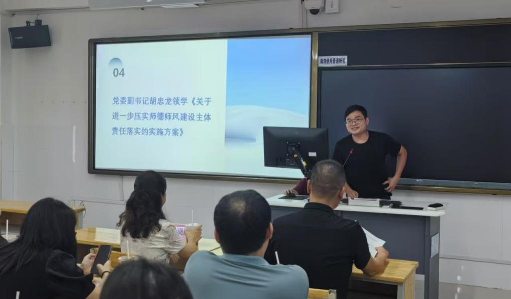 会上,学院党委副书记胡忠龙主领学了《关于进一步压实师德师风建设主体责任落实的实施方案》并通报了近期高校发生的违反职业行为准则的典型案例,开展了深刻的警示教育。他指出教师不仅是知识的传播者,更是学生品德的塑造者。加强师德师风建设,是落实立德树人根本任务的关键所在,要求全体教师以高度的责任感和使命感,自觉践行师德规范,树立良好教师形象。