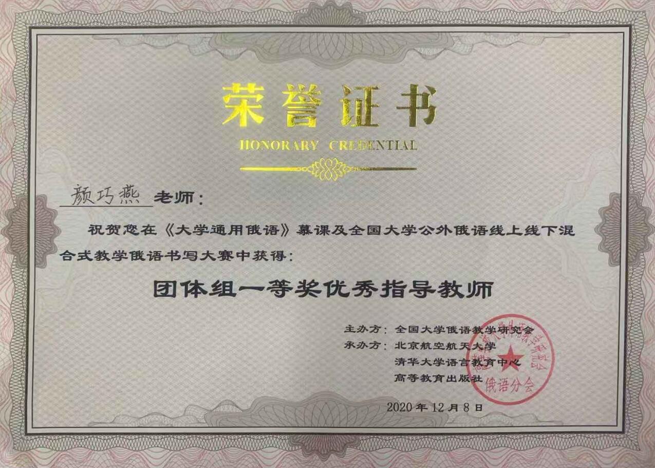 近日,由教育部高等学校大学外语教学研究会(俄语分会)、北京航空航天大学、清华大学语言教育中心、高等教育出版社共同举办的《大学通用俄语》慕课及全国大学公外俄语线上线下混合式教学俄语书写大赛圆满结束。经主办方与北京市大学俄语教学研究会专家评选,永利获得团体一等奖,商务专业学生雍晔、陈巧、邹文星分获个人一、二、三等奖,指导教师颜巧燕获“优秀指导教师”称号。(外国语学院 陈柯)