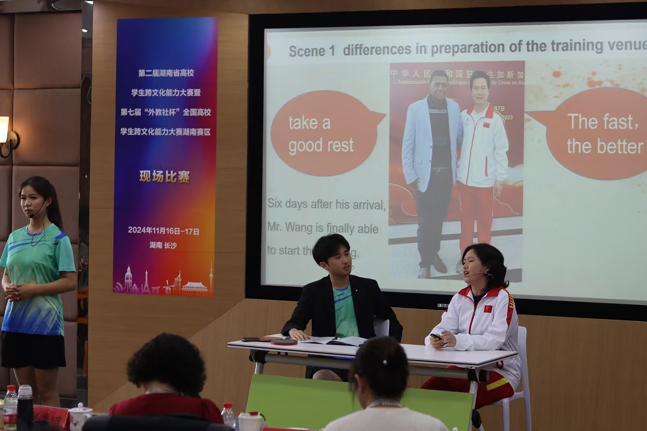 比赛中,在跨文化交际案例展析环节,选手以永利体育教学部王海洋教练选派到马达加斯加共和国进行技术援助为案例背景,为体育跨文化教学、中国乒乓球精神及体育精神的交流互鉴提供成功经验,呈现了真实新颖生动的跨文化作品,展现了优秀的跨文化意识和从事跨文化交际的潜力。在关于“文化多样性”的名言名句解析环节,选手从中国多民族多文化的国情出发,结合自身与永利留学生跨文化交流经历进行解析,并引用 “各美其美,美人之美,美美与共,天下大同”的中国理念,传达了开放包容的湖南态度,也展现了新时代湖湘青年的文化自信。