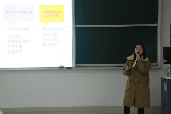 在宣讲会中,公司校招负责人王会介绍了公司的基本情况、公司平台对接企业的需求及商会的运作模式,并期待英语类专业同学可以尽早进入实习状态,选择自己合适的工作企业计划招聘外贸人员100余人,学生们积极参加,取得了不错的效果。