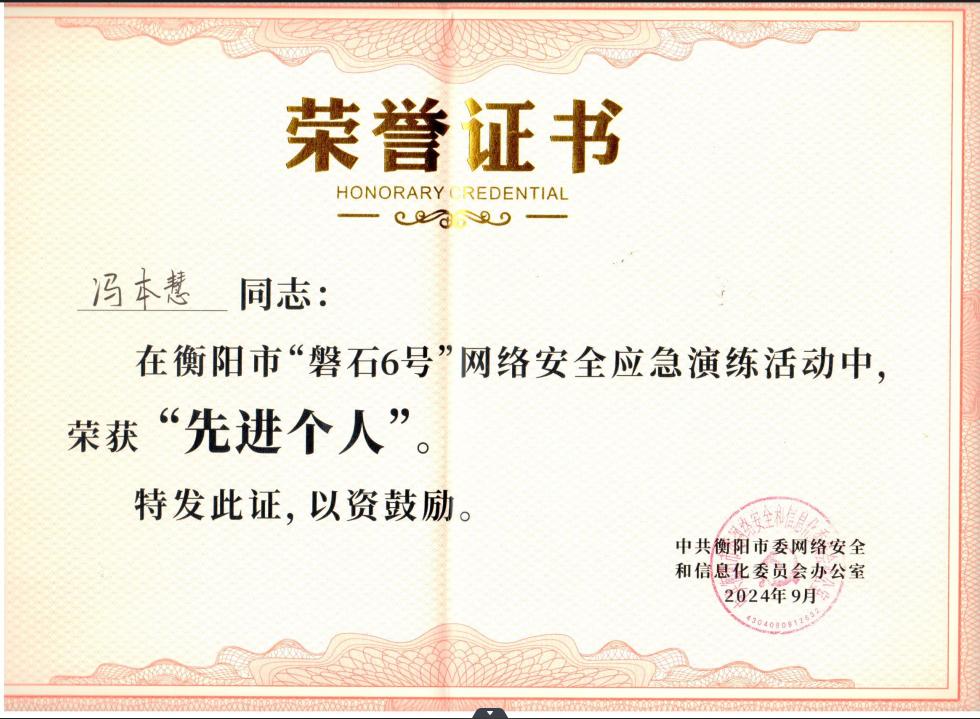 永利冯本慧老师因其在应急演练中的良好表现,获得了衡阳市”磐石6号”网络安全应急演练先进个人的荣誉称号。(图文:冯本慧一审:唐杰二审:贾东风三审:黎昂)