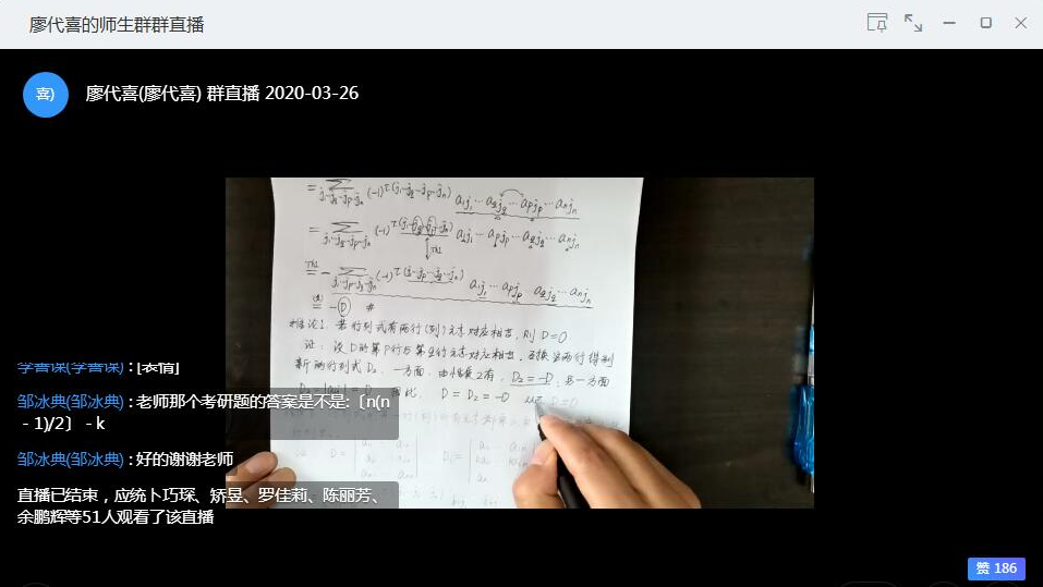 往事不可追,未来犹可期。疫情尚未结束,直播仍在进行。正是有一大批像廖代喜老师这样兢兢业业的老师们精心打造着一堂堂精彩的授课,“停课不停学、停课不停教”的号召落到了实处。(数理科学与能源工程学院