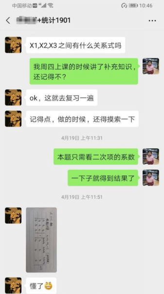 要学好数学,肯定离不开动手训练。每次课后,廖代喜老师都会在微信群发布事先准备好的作业题,要求学生做完作业后扫描,以班级为单位打包上交,并针对每章作业上一次习题课。他还时常利用微信与QQ解答学生在学习过程遇到的各种疑难问题。