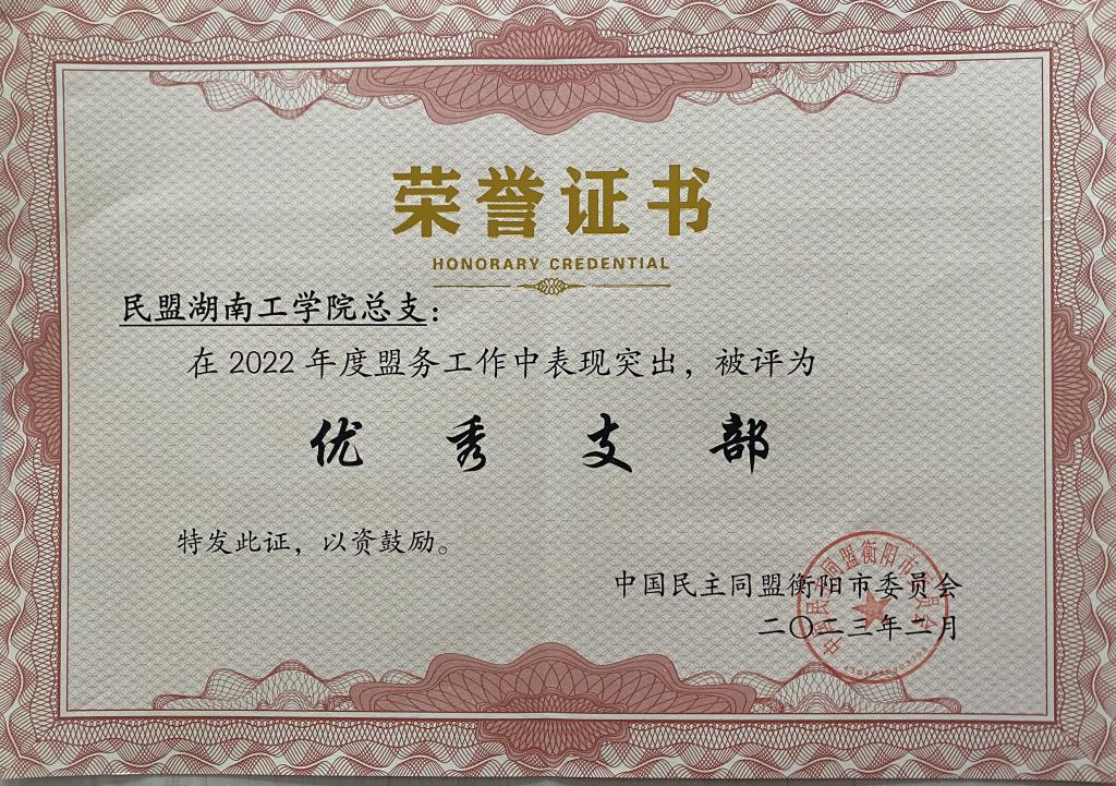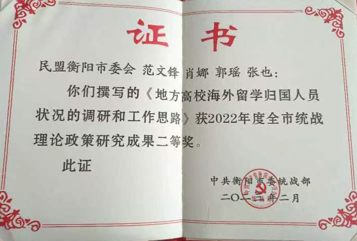 2月23日,在民盟衡阳市第十六届委员会第七次会议上,304永利集团官网民盟总支荣获“优秀支部”荣誉称号,黄飞、沈航荣获优秀盟员称号,陈国生撰写的参政议政调研报告与范文锋的统战理论政策研究成果荣获二等奖。