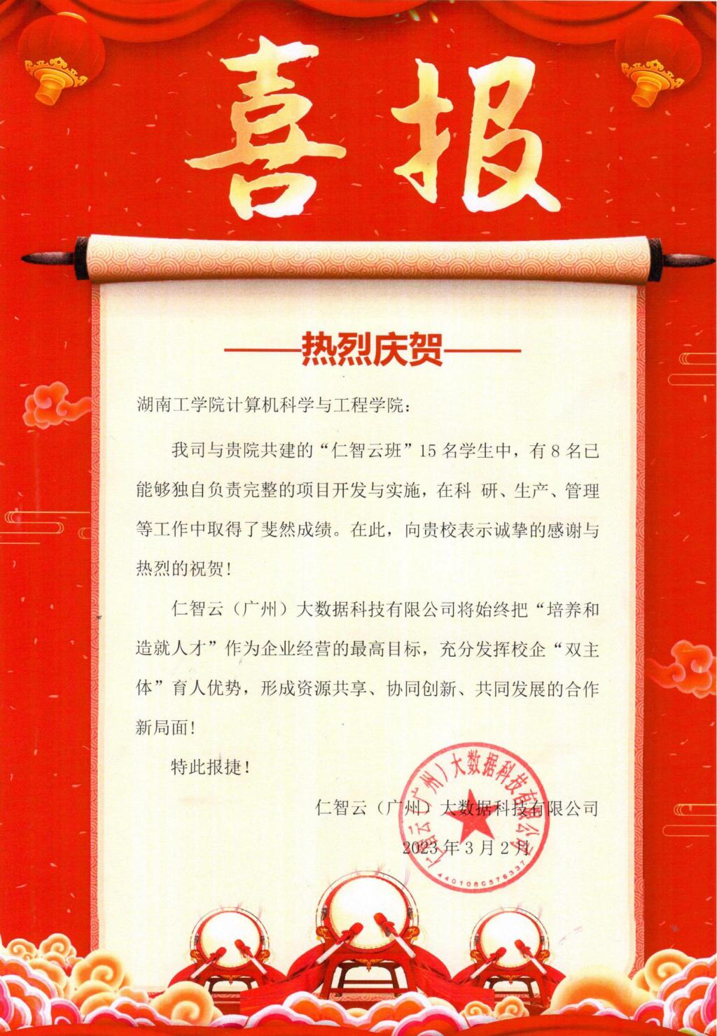 近日,永利计算机科学与工程学院收到来自仁智云(广州)大数据科技有限公司发来的喜报。喜报中充分肯定了永利计算机科学与工程学院与贵公司共建的“仁智云班”校企合作育人模式,认为这一模式在充分高效利用校企资源培养学生岗位实践能力的同时也为企业发展提供强大人才助力。喜报中也对计算机科学与工程学院学生特别是“仁智云班”15名学生中,有8名已能够独自负责完整的项目开发与实施,在科研、生产、管理等工作中取得了斐然成绩给予高度认可,并对今后加强校企深度合作,探索实践产教融合校企合作寄予期望。