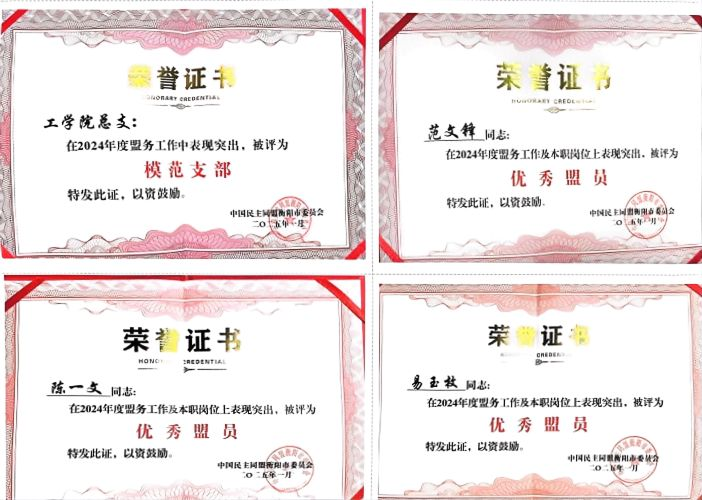 2025 年 1 月 9 日,在民盟衡阳市第十六届十一次市委(扩大)会议之上,民盟304永利集团官网总支喜获 “模范支部” 荣誉称号,范文锋、陈一文、易玉枚三位同志则荣膺 “优秀盟员” 称号。这些殊荣,是对民盟永利总支在组织建设、参政议政以及服务社会等诸多方面所付出努力与取得成绩的高度认可与肯定。