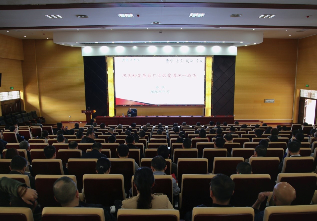 杨朗以“巩固和发展最广泛的爱国统一战线”为题。从统一战线的发展历程、新时代统战工作的要求、对学校做好新时代统战工作的建议等三个方面出发,结合永利近年来统战工作开展情况,号召全校上下要以树立大统战工作意识,积极构建党委统一领导的大统战工作格局,为学校改革发展稳定和服务地方经济社会发展凝心聚力。