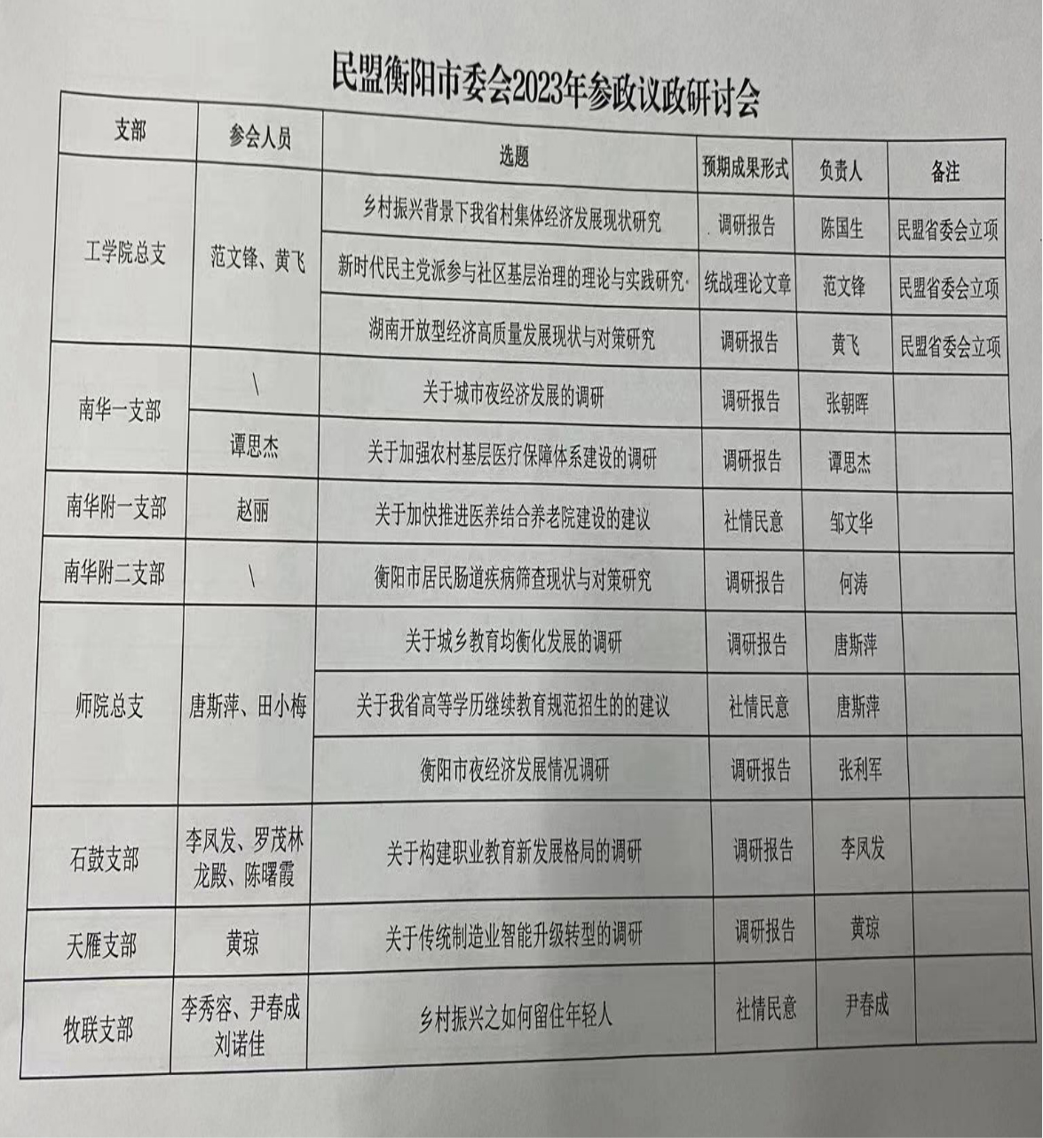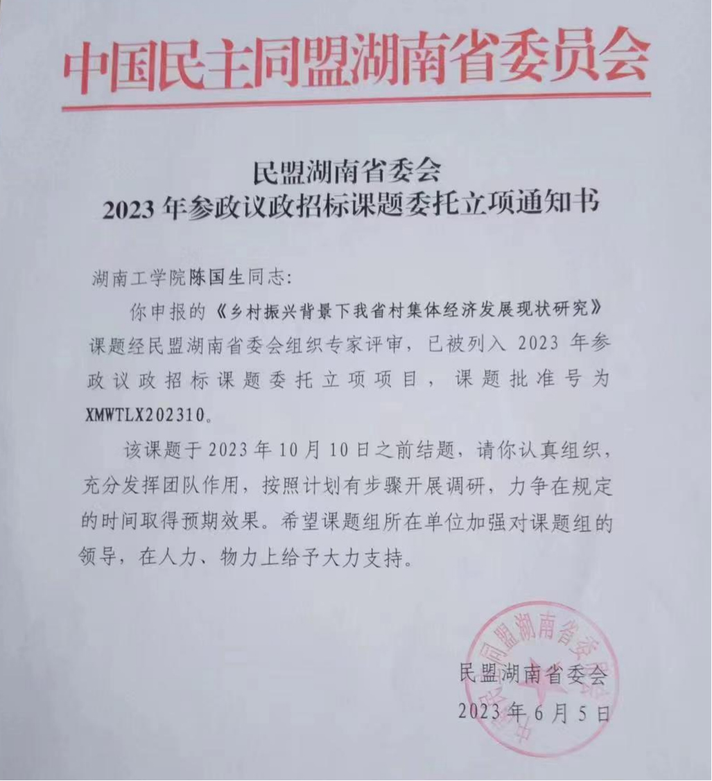 肖中云教授的《新时代高校党建与统战工作协同发展的探索与实践》、游春华教授的《习近平总书记关于新时代党的统一战线工作的思想实践逻辑研究》和彭艳老师的《新时代党外知识分子统战工作的创新思路和实践路径》获省委统战部立项;范文锋教授的《新时代民主党派参与社区基层治理的理论与实践研究》、陈国生教授的《乡村振兴背景下我省村集体经济发展现状研究》、黄飞教授的《湖南开放型经济高质量发展现状与对策研究》获民盟湖南省委会2023年度立项。(范文锋)