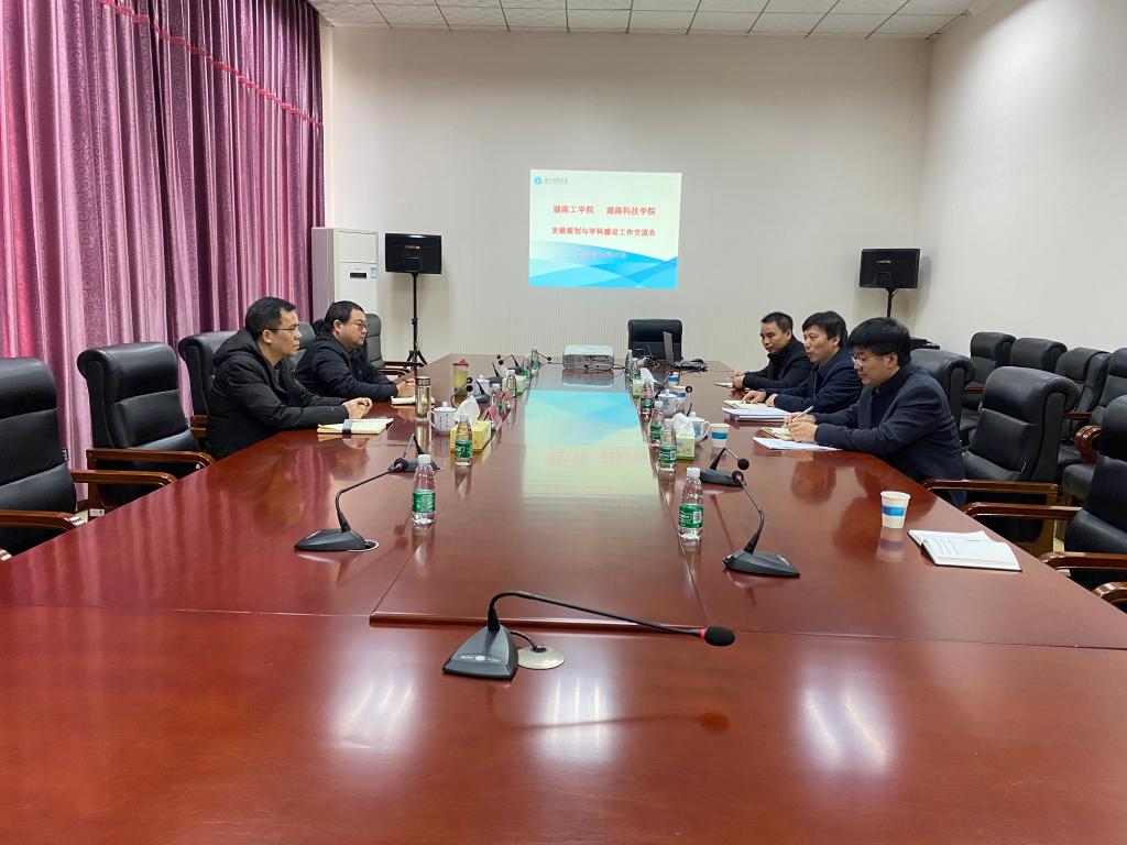 12月21日下午,学科建设与发展规划处处长彭立新一行赴湖南科技学院考察交流,并在该校党委会议室进行了交流座谈。座谈会由湖南科技学院发展规划与学科建设处潘剑锋处长主持,该处副处长周芳检等出席座谈会。