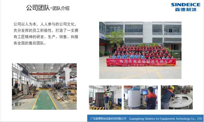广东森德制冰设备科技有限公司,是一家专业从事制冰机研发设计、生产销售、工程安装和售后服务为一体的国家高新技术企业。公司以“以人为本,共同持股,人人参与”作为企业文化,打造了一支拥有工匠精神的技术团队和服务全球的销售及售后团队。