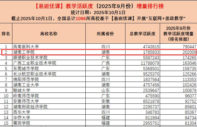 近日,教育部易班发展中心公布2025年9月“易班优课”教学活跃度增量排行榜,永利在全国基于【易班优课】开展“互联网+思政教学”的1096所高校中表现出色,位列全国第二、湖南省高校第一,再次展现出学校在“互联网+思政教学”领域的强劲实力。