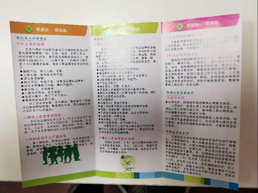 大学生成长中心针对新生适应阶段的心理成长特征,编制心理健康知识宣传册,涵盖“学习心理”、“建立和谐的人际关系”、“找回遗失的自信”、“应对焦虑和抑郁”等主题,创设常见情景,帮助同学们提升心智,从自我成长视阈帮助大学生适应新生活,打好预防针,提升自我管理、自我服务的能力。