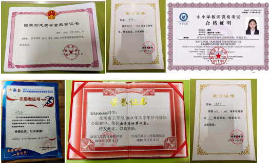 在校获国家奖学金1次、国家励志奖学金1次、校一等奖学金2次、三好学生2次、优秀共青团干部1次,三下乡优秀个人1次;顺利通过英语四级考试,国家计算机二级考试;在课余时间,积极参加学校各类学科竞赛,志愿者活动。