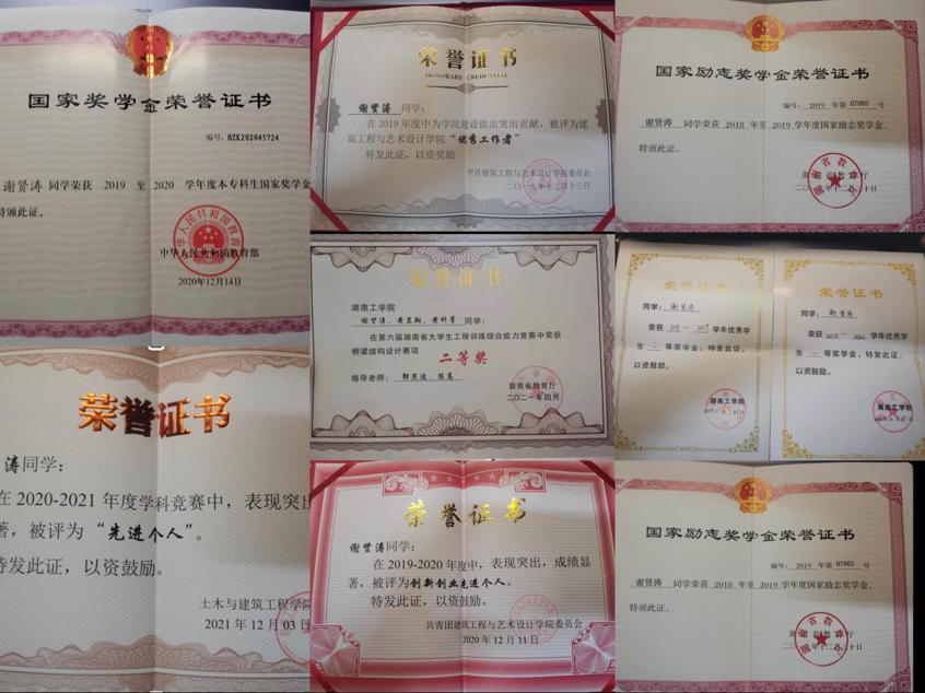 在校期间学习成绩与综合测评成绩连续三年保持专业前列,荣获国家奖学金,国家励志奖学金,校级奖学金,校级优秀学生干部,校级优秀工作者等各类荣誉20余项;获304永利集团官网结构设计大赛三等奖;2022届鲁班BIM毕设大赛二等奖;积极参与校内外志愿者活动,被评为“衡阳市优秀青年志愿者”。