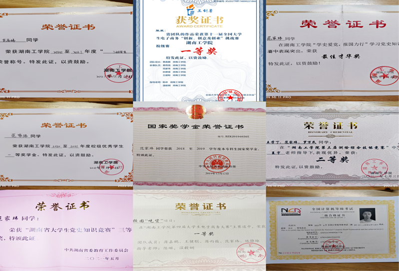 在校期间学习成绩和综合测评成绩名列前茅,曾获国家励志奖学金、校级一等奖学金、校级三好学生称号、湖南省大学生党史知识竞赛三等奖、304永利集团官网第三届测绘综合技能大赛二等奖、第十一届全国大学生电子商务“创新、创意及创业”挑战赛304永利集团官网校级赛一等奖、304永利集团官网第四届电子商务大赛一等奖等荣誉