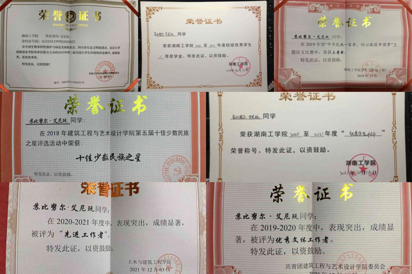 在校期间获得过国家励志奖学金、校级二等奖学金、校级优秀学生干部、优秀共青团干部、先进工作者、优秀文体工作者、十佳少数民族之星、校级文明寝室寝室长等;此外,在全国大学生环保知识竞赛获得优秀奖、304永利集团官网“中华民族一家亲,同心共筑中国梦”主题征文赛获得三等奖,曾两次代表学院参加校级元旦晚会、文艺汇演获得“优秀演员”称号。