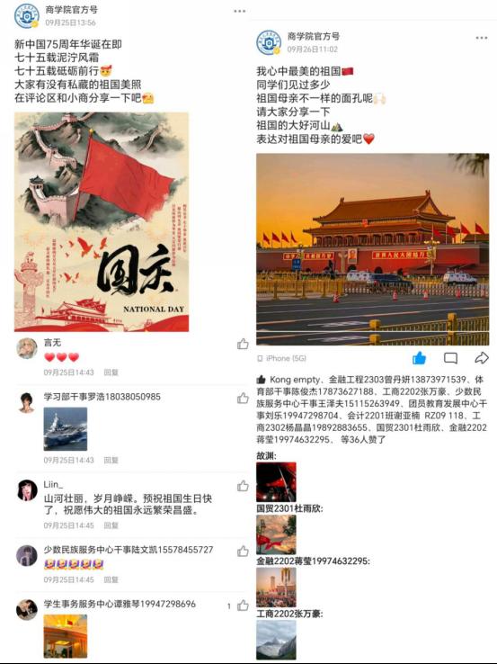 为庆祝中华人民共和国成立75周年,唱响新时代爱党、爱国、爱民的主旋律。9月4至10月1日,在举国同庆之际,我院结合实际,通过绘制爱国板报、拍摄微视频、观看历史纪录片、祝福美好祖国、分享大好河山等方式激发青年学子爱国之心,构建全员育人、全过程育人、全方位育人新生态,落实立德树人根本任务。