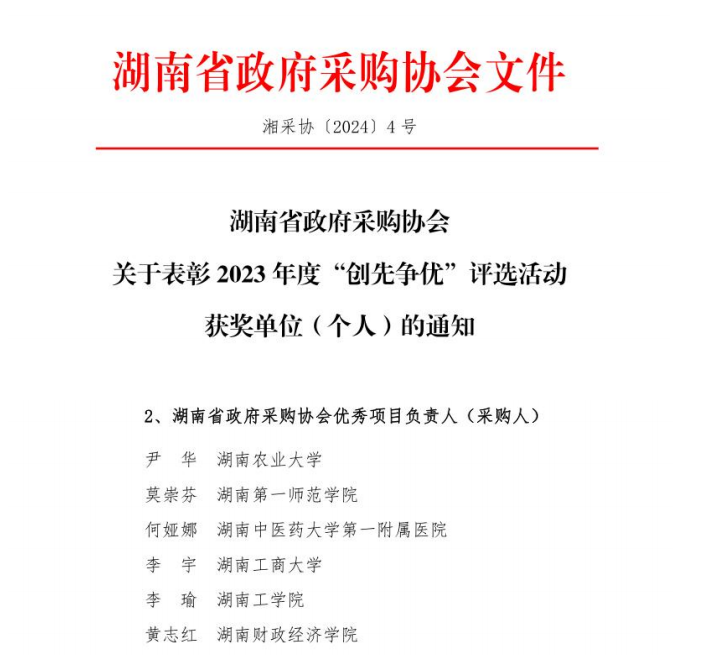 昨日,湖南省政府采购协会会员大会暨2023年度“创先争优”颁奖活动在长沙举办,永利招投标管理办公室主任李瑜获得“湖南省政府采购协会优秀采购人”荣誉。